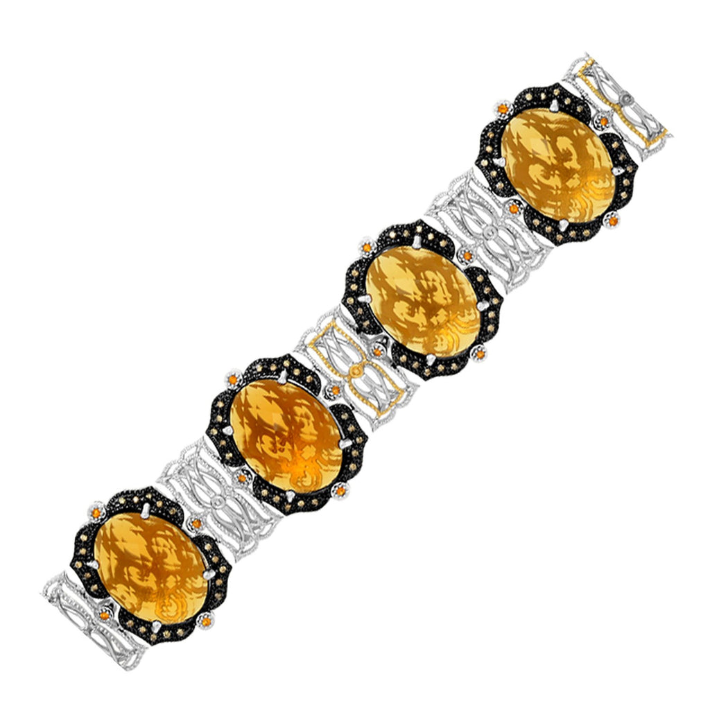 Positively stunning, this elegant bracelet features links of oval citrines with diamond and whiskey quartz embellished frame elements. Made of sterling silver with 18K yellow gold connector detailing. Measures 7 1/2 inches.