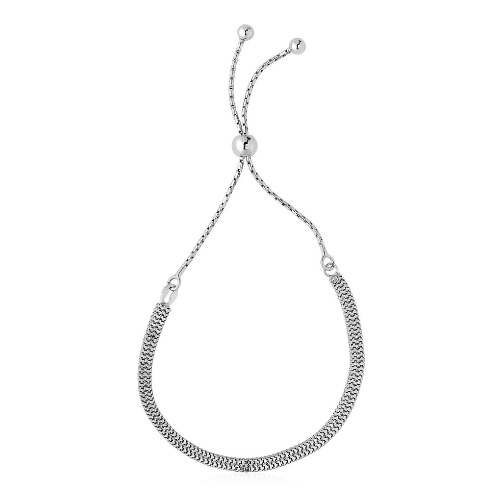 This adjustable sterling silver bracelet features a classic curve reminiscent of a box chain. Bracelet closes with a draw string clasp.