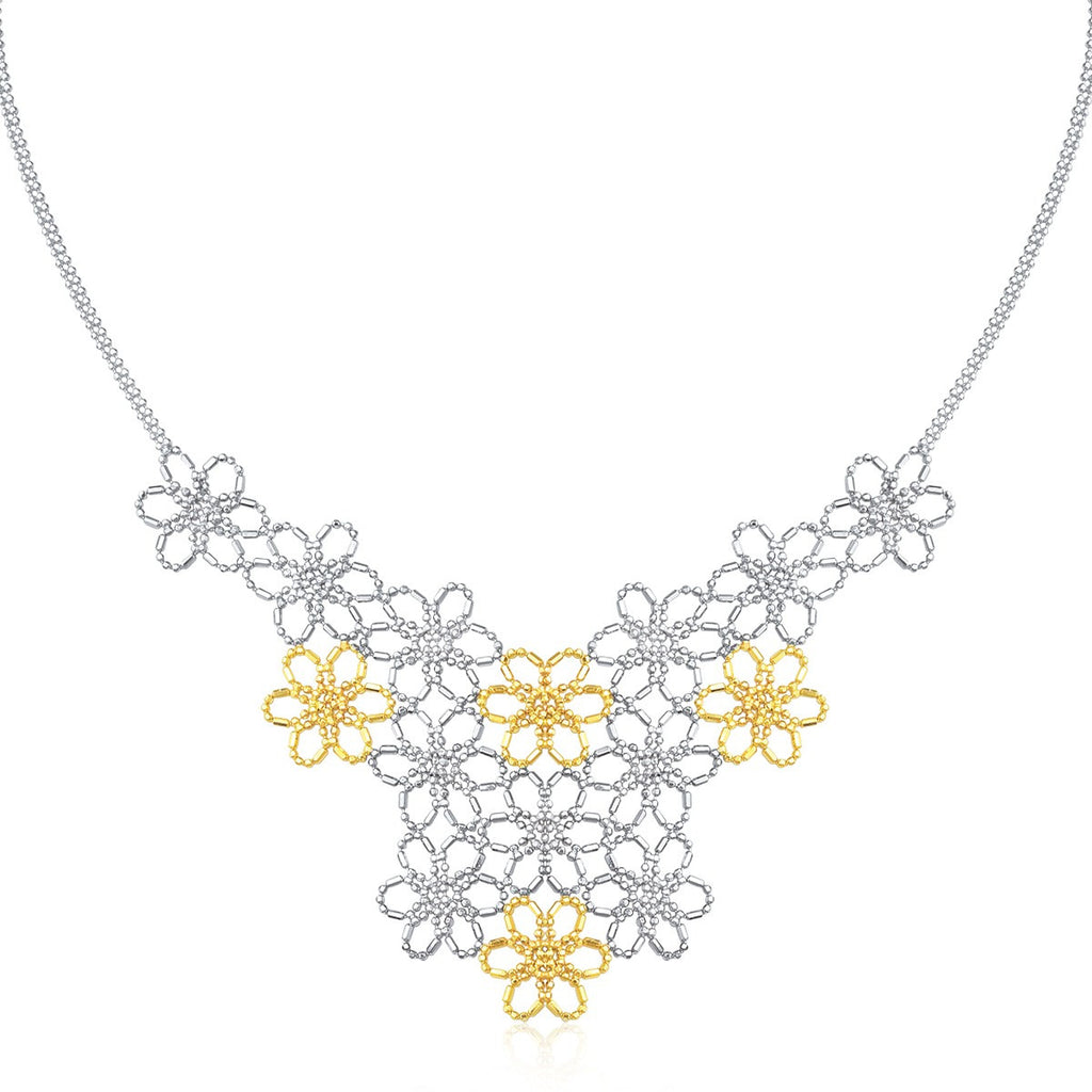 Beaded clusters of floral motifs in sterling silver stand out in this statement necklace with accenting 14K yellow gold flowers. Measuring a length of 18 inches, the floral arrangements are suspended from a double beaded chain.