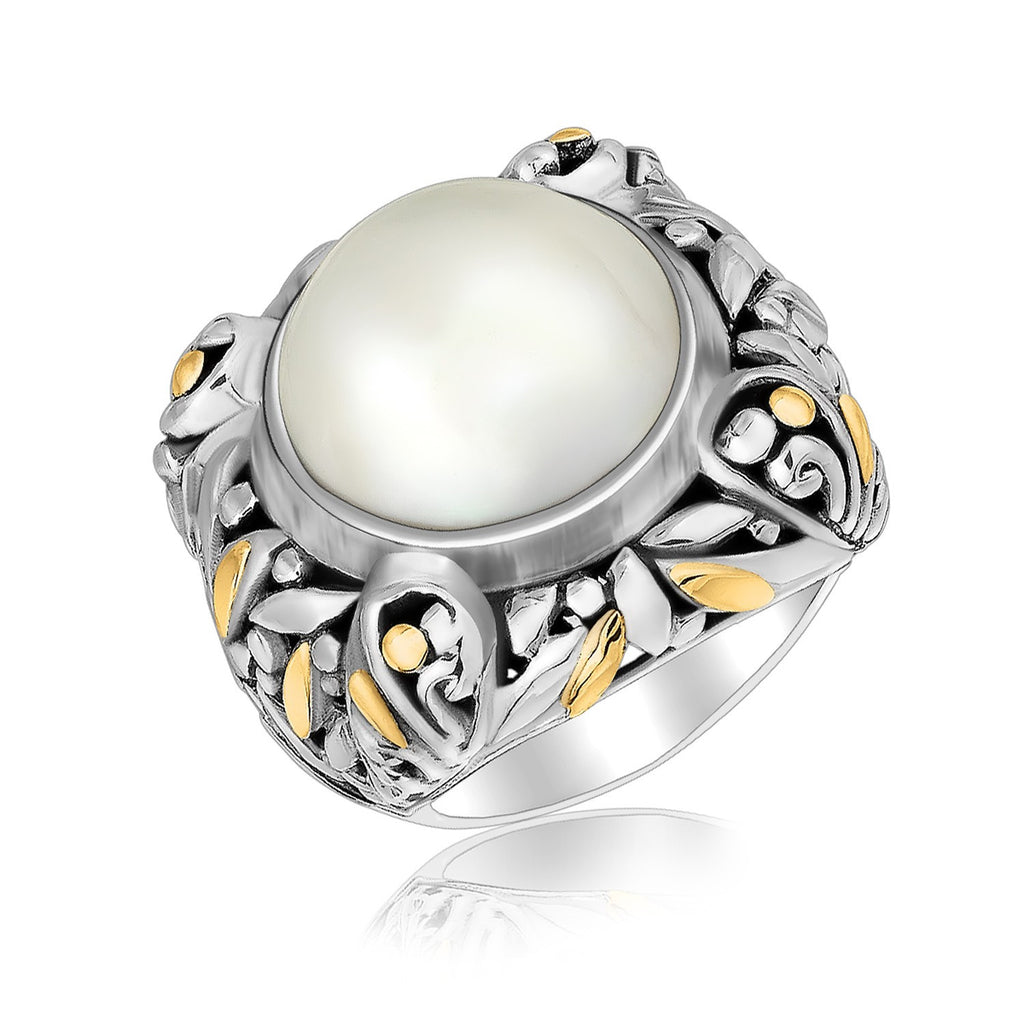 Organic leaf motif elements highlight the beautiful 14mm pearl accent of this stylish ring. Comes in sizes 5 to 9 and made of superb sterling silver and 18K yellow gold.